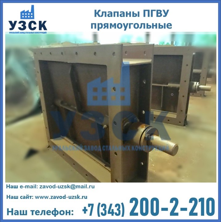 Прямоугольный клапан ПГВУ имеет прямоугольную или квадратную форму, по основному сечению конструкции, на которую устанавливается клапан. Для изготовления в Алма-ате применяются сталь или чугун, в зависимости от модели. Внутри клапана имеется запорный элемент, передвигающийся параллельно общему потоку движения среды. Шибер ПГВУ имеет такую же форму, как и основное сечение. Перемещение створки происходит благодаря возвратно-поступательным движениям.