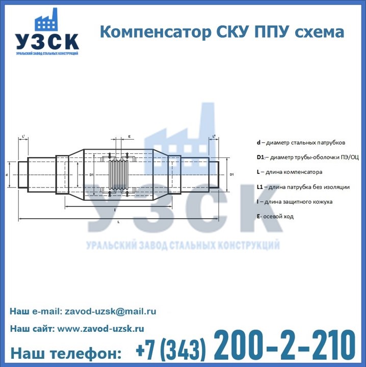 Уральский Завод Стальных Конструкций в Алма-ате предлагает готовые изделия, а также вы можете приобрести компенсатор СКУ ППУ под заказ. Наш завод располагает всем необходимым оборудованием для производства нестандартных позиций компенсатора СКУ в ППУ изоляции. Завод «УЗСК» предлагает большой выбор качественных и надежных компенсаторов СКУ ППУ, полностью укомплектованных и готовых к эксплуатации. Мы гарантируем соответствие нашей продукции всем требованиям ГОСТ и ТУ, износостойкость и высокую производительность. Наше предприятие поставляет и производит оборудование, имеющее длительную гарантию и большой эксплуатационный ресурс. Если вы хотите заказать сильфонные компенсационные устройства СКУ ППУ или другое оборудование с доставкой, наши специалисты помогут рассчитать стоимость транспортных расходов и организуют доставку товара. Вы можете оформить заказ на продукцию на нашем сайте, для этого достаточно заполнить форму обратной связи.